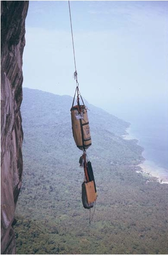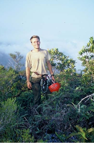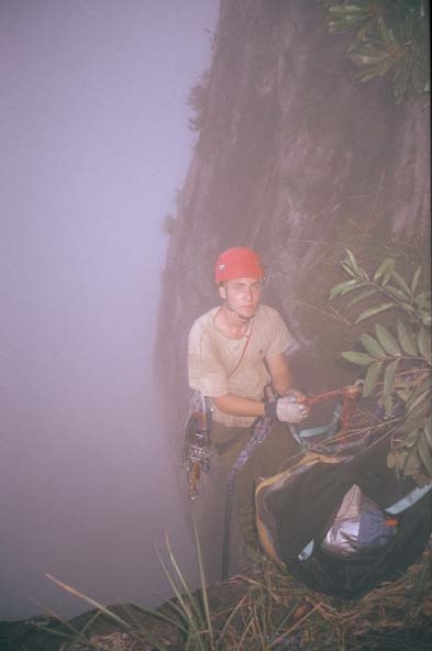We endured one particularly terrifying lightning storm on the third night; other than that we had excellent weather. Pitch 5 was the crux, where Nick Tomlin drilled 5 rivets to reach a thin crack, and then used aliens, hooks, micro nuts and a very sketchy tricam placement to lead us onto the lower angled upper portion of the wall (pitches 3-5 are vertical to slightly overhanging). Pitches 7-10 were climbed in a summit push on the last day, and involved mostly free climbing interspersed with some aid. Pitch 9 involved spectacular runnout 5.9 face climbing on funky dimples and scoops in a water groove. The top was spectacular, a perfectly flat bonzai garden with stupendous views of the ocean, the island’s interior, and the surrounding peaks. We stacked a cairn on the summit boulder and snapped some photos before rappelling to our portaledge on top of pitch 7 for the night, and then to the ground the next day.