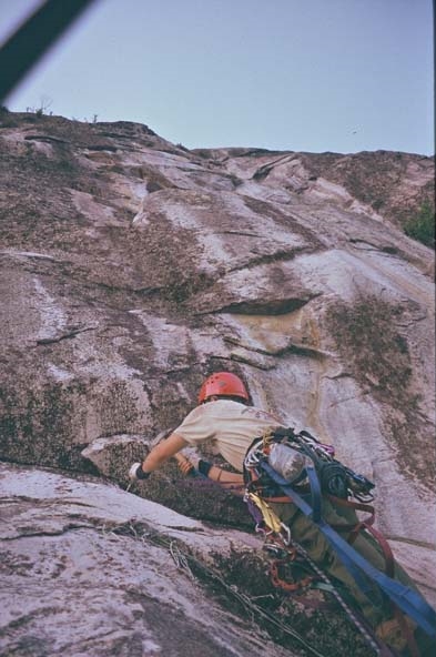 The 10 pitch line required the drilling of 10 rivets and 8 bolts (for belays), in addition to the bolts already in place on pitches 1-4 from our previous attempts (1996 and 1998). The rock is of relatively good quality granite, and our line follows the most obvious weakness up the face. We placed a handful of pins; the route will go clean very easily.