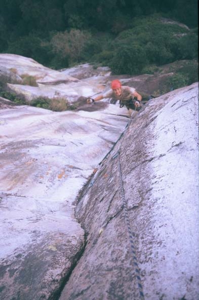Pitch1 – F4 (35m). Vertical Jungleneering. Starts 6m left of the neck. Thrash up the vegetated gully for 20m, then briefly onto the smooth face. At the apex of the face enter the vertical forest, and head straight up to large tree below rock face next to belay terrace.