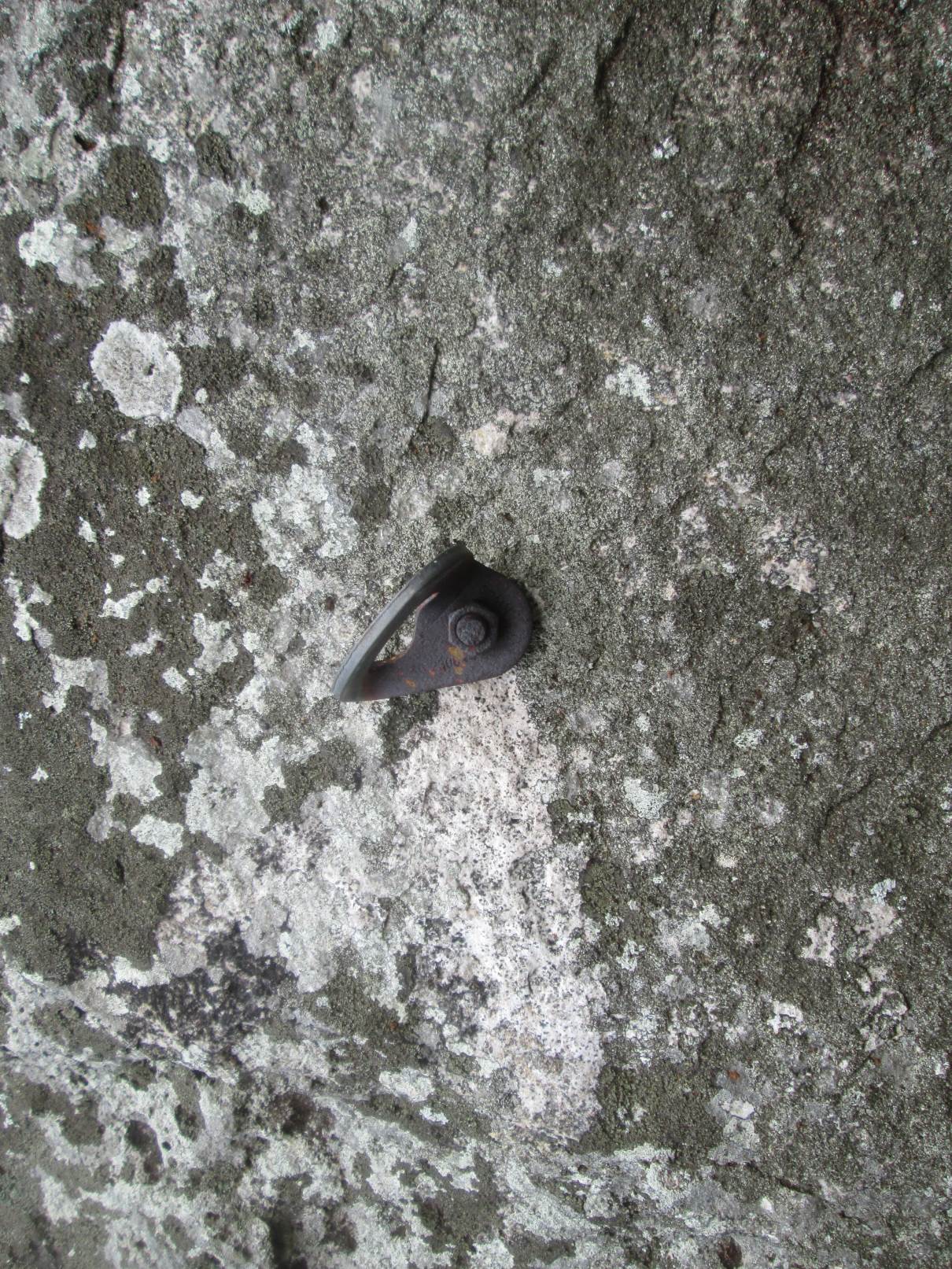 All the bolts marked in the original topo show material signs of oxidisation, and appear to be combinations of carbon and/or galvanised steel. They have thin (6mm? 8mm?) threads, and seem variously RAWL and Pin-drive expansion bolts. Although none failed under our body-weight loads, we recommend proceeding with extreme caution – and not relying solely on these bolts in critical locations. We have replaced these bolts at crucial stances.
